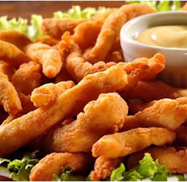 Tiras de filé de frango empanado.